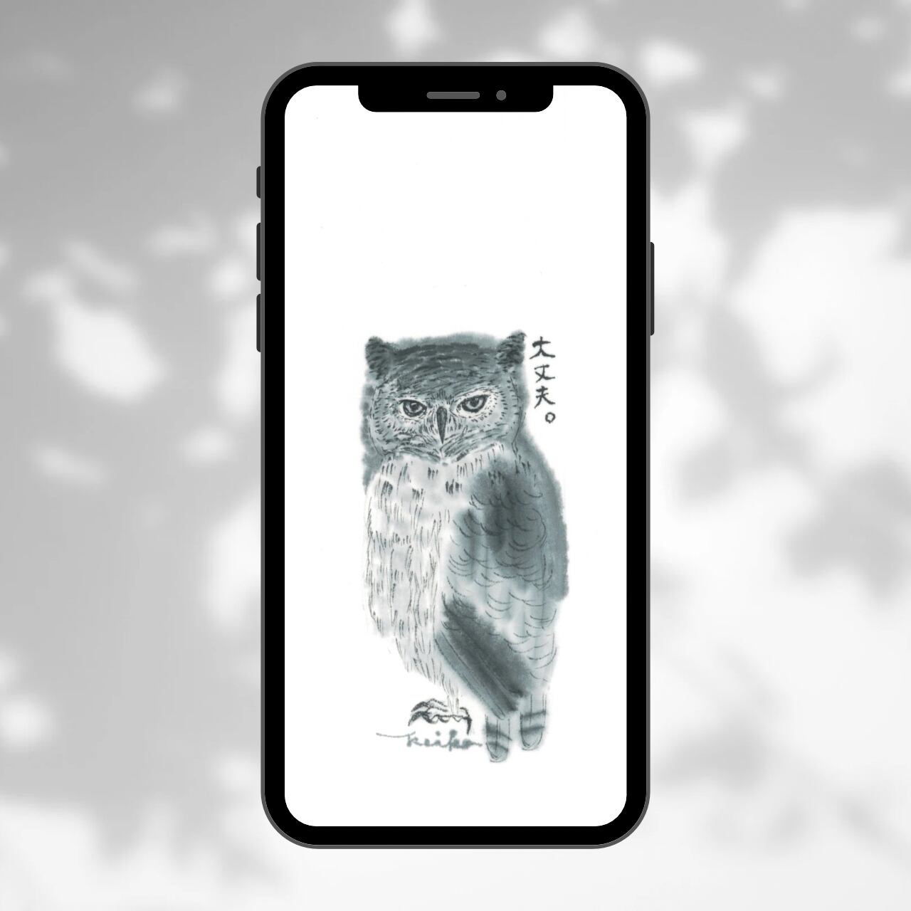 水墨画で描いたミミズクに、筆文字で「大丈夫。」のことばを添えたデザインのスマホ壁紙です。