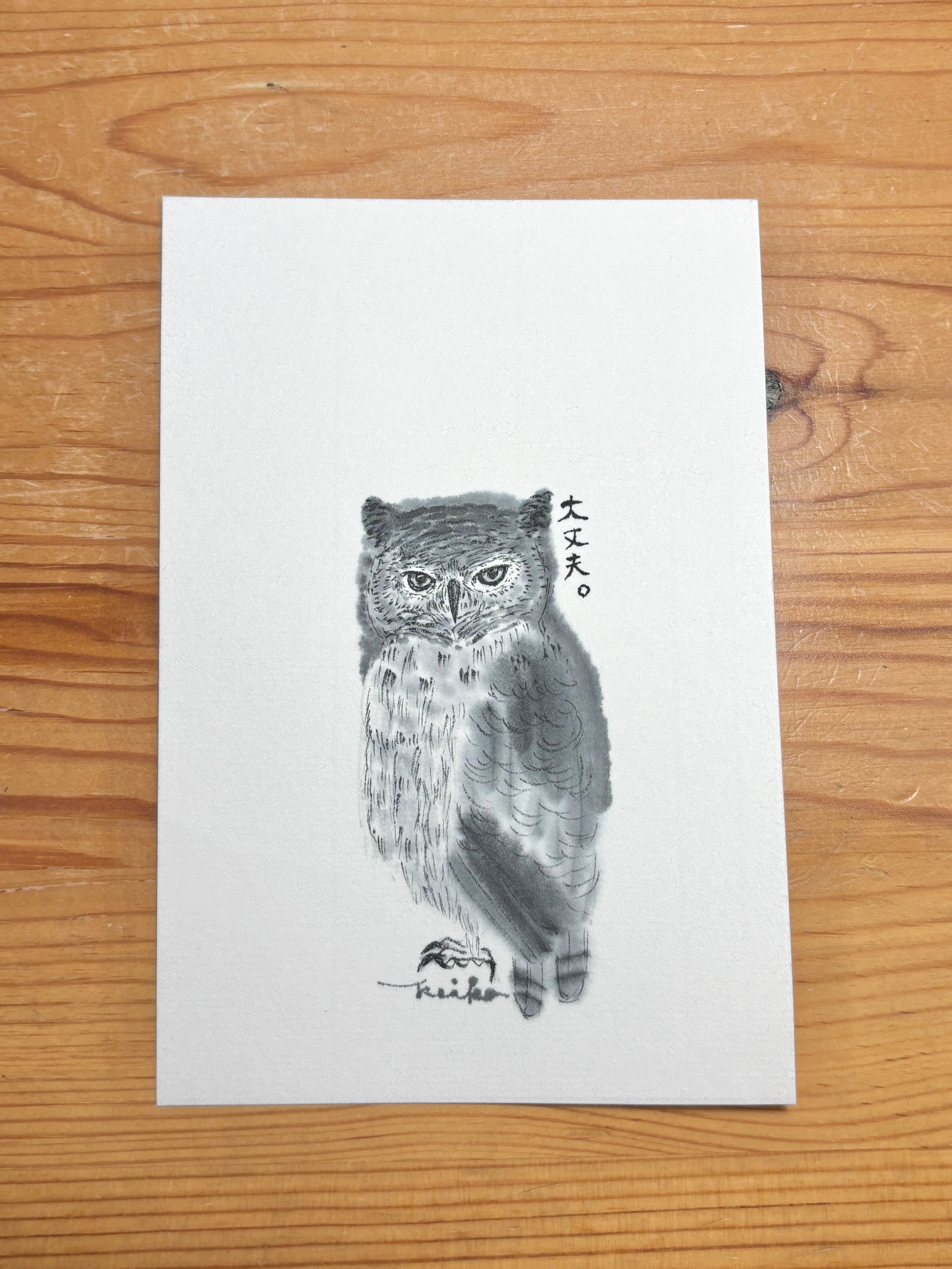 墨で描いたミミズクに、筆文字で「大丈夫。」のことばを添えた水墨画ハガキです。